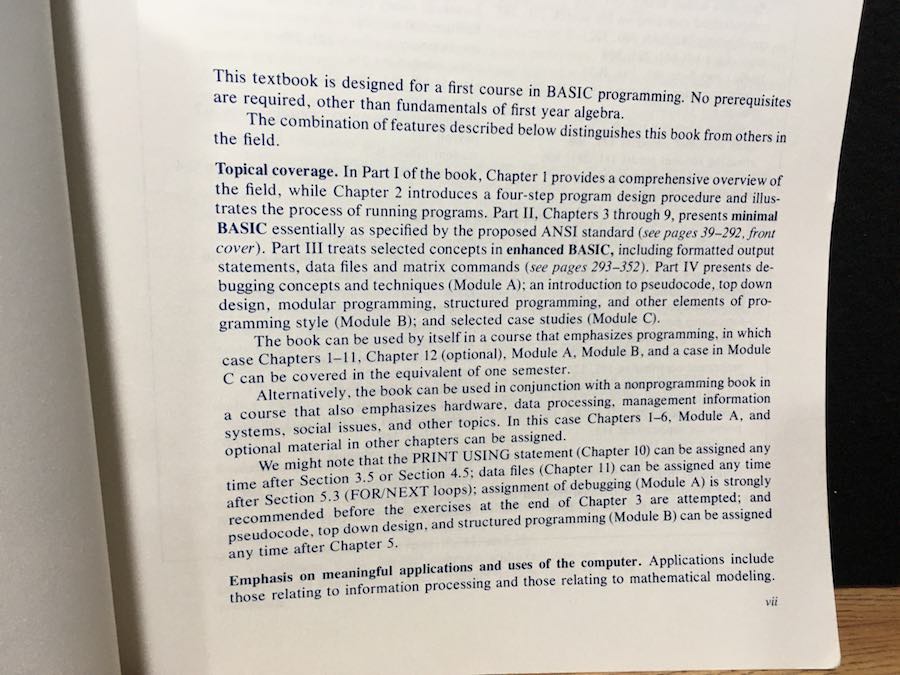 This textbook is designed for a first course in BASIC programming. No prerequisites are required, other than the fundamentals of first year of algebra.