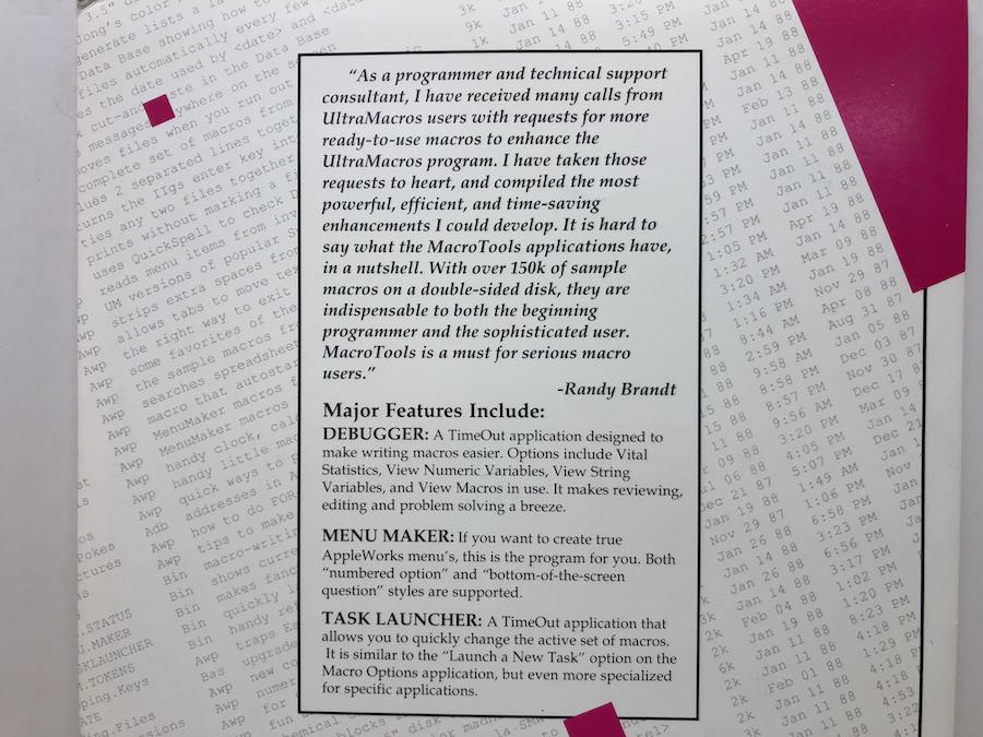 Macrotools is a collection of macros that teaches AppleWorks new tricks. Debugger, Menu Maker, Task Launcher and more.