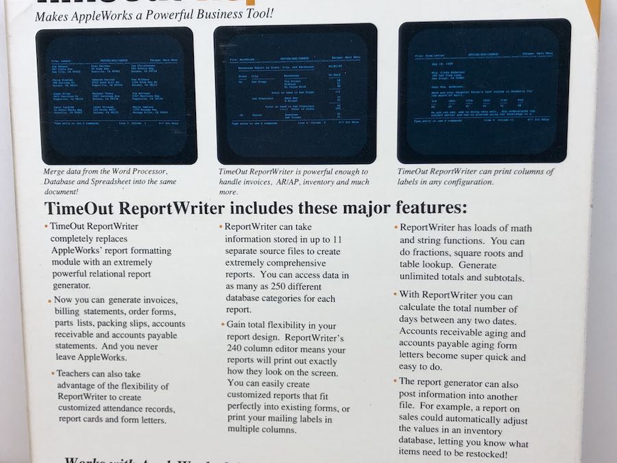 Place data fields and text anywhere you like. Define headers and footers. You can combine up to 245 database categories or spreadsheet columns from up to eleven different AppleWorks files!