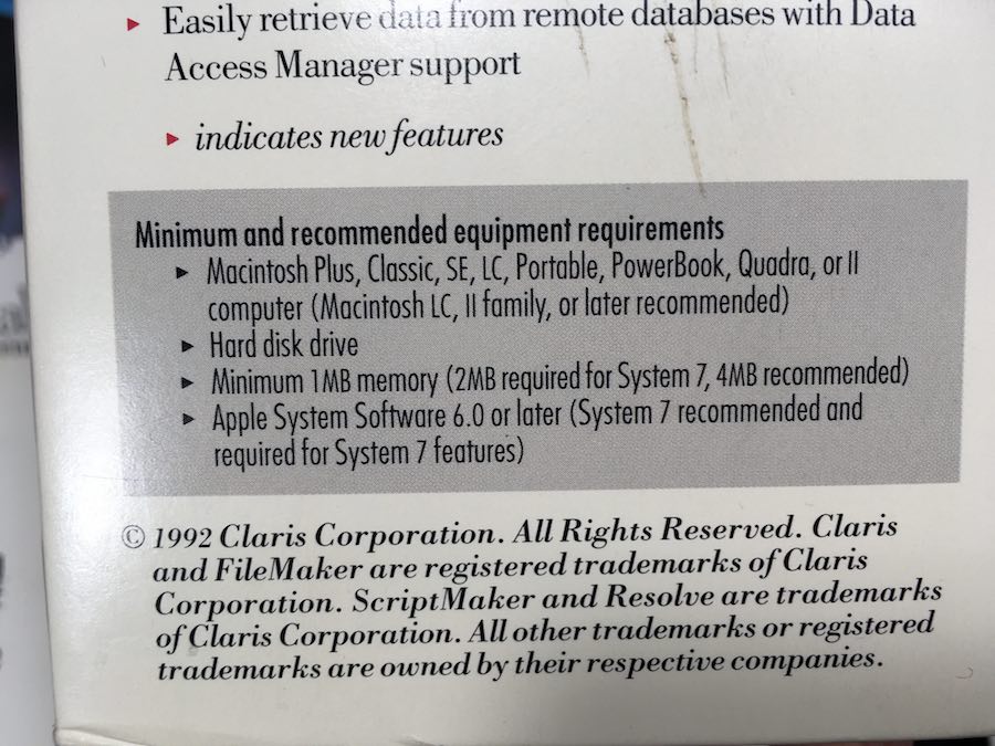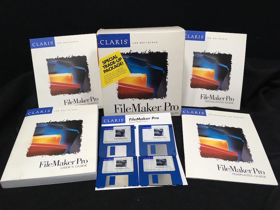 - 4 – 3.5″ disks: 2 Installation disks, Examples/Templates disk, and Utilities disk which includes the Claris Translators, Main Dictionary, User Dictionary, AppleTalk, and Claris Help System.