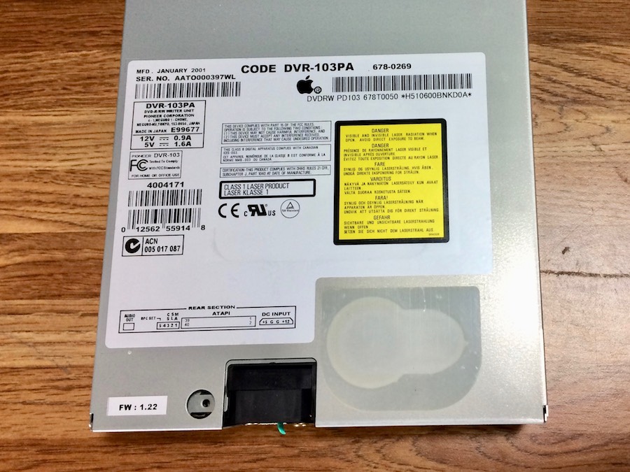 Apple Pioneer Internal DVD-RW Atapi (IDE) Drive – DVR-103PA, Apple 678-0269. This drive was pulled from a Power Mac G4 Graphite computer.